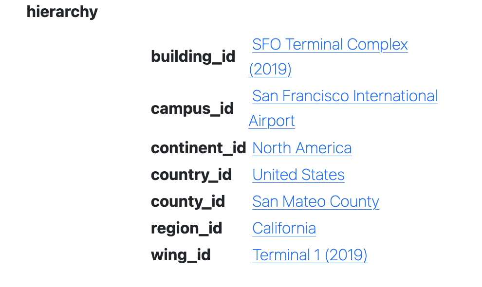 If you look closely at that screenshot you’ll see that most of the other places the terminal building is associated with don’t have names. The exceptions are the terminal complex and the airport itself. That’s because both of those records are part of the sfomuseum-data-architecture repository which we’ve referenced in the -reader-uri flag at startup.